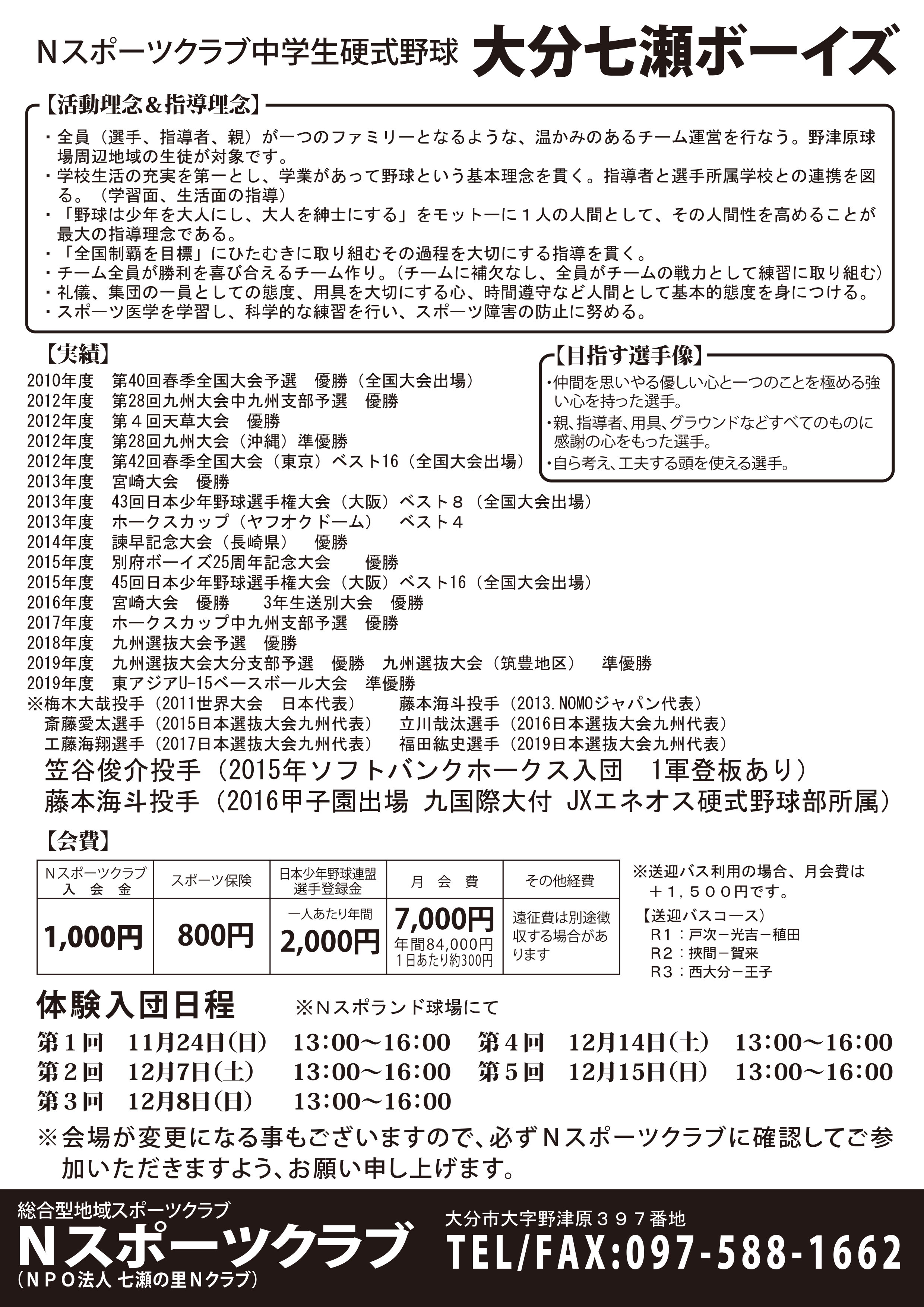Nスポーツクラブでは、2020年度の中学生硬式野球チーム「大分七瀬ボーイズ」の選手を募集しております!下記の日程で体験入団を開催します。